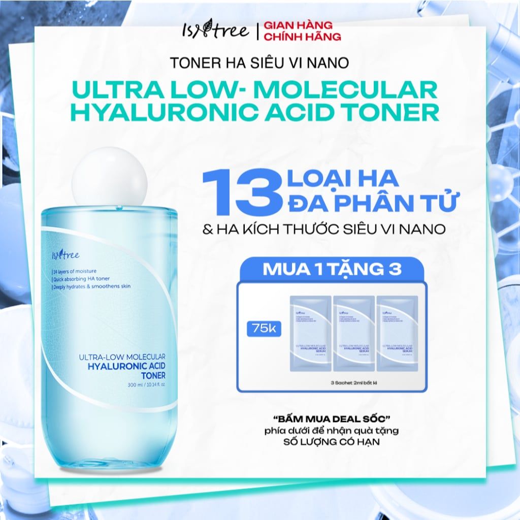 Toner thuần chay HA siêu vi nano cấp ẩm chuyên sâu & căng bóng da Isntree Ultra-low Molecular Hyaluronic Acid 300ml
